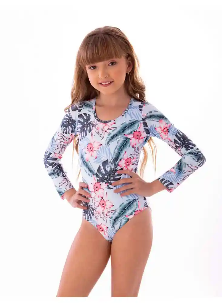 Vestido de baño entero manga larga cuello redondo, con escote profundo en espalda y tiras para amarre. Tela gruesa de calidad (no se motea) y estampados de alta resistencia la cloro y desgaste.